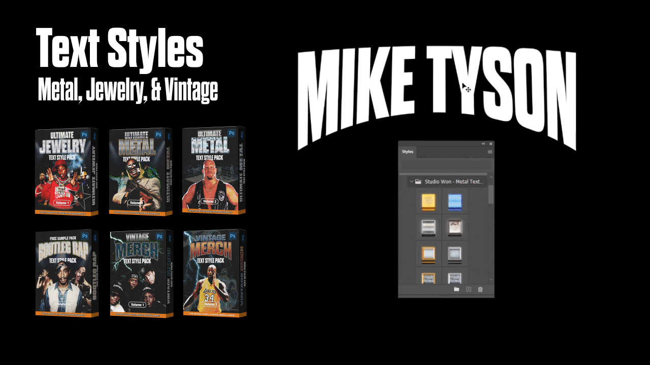 The Complete Text Style Collection is the ultimate bundle of all text effect presets released by Studio Won. This bundle includes over 150 layer style presets, perfect for bootleg rap t-shirts, vintage-style graphics, and sports merch. Easily simulate jewelry, metal, and vintage sports text effects with a single click!