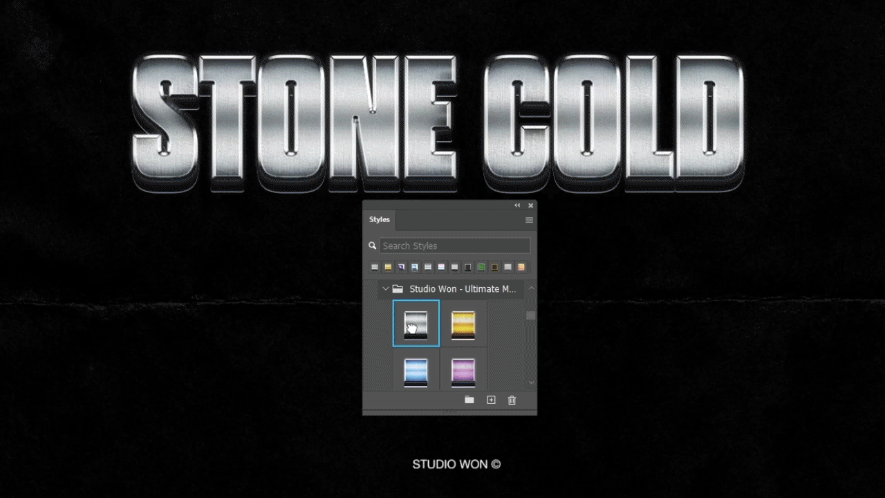 This text style pack contains 35 layer style presets that give your text a stylized metal effect with a single click. Each style in this pack has been designed to mimic various metal finishes, including sleek brushed steel, lustrous chrome, dazzling gold, rugged iron, and many more. The subtle gradients, textures, and 3D effects add depth and detail to your text.